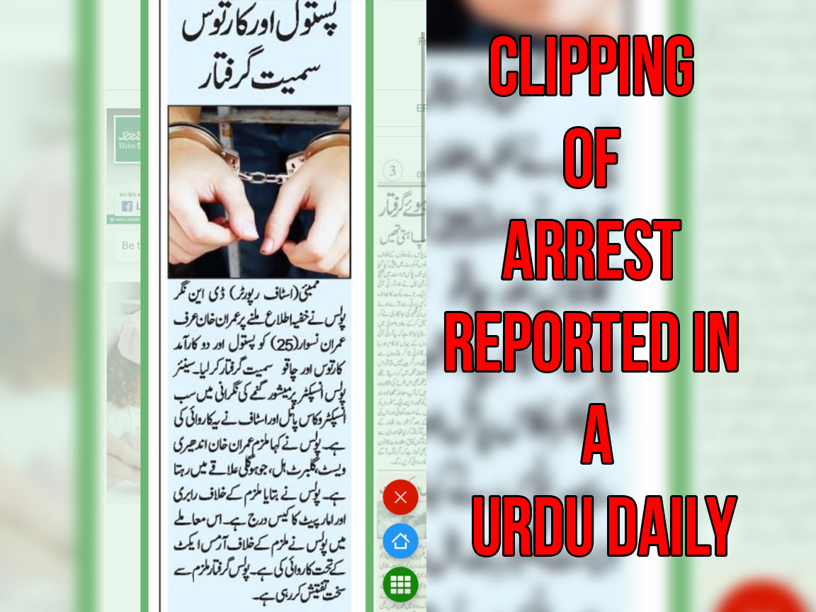 News item in a Urdu paper reporting Imran’s arrest under Arms Act.