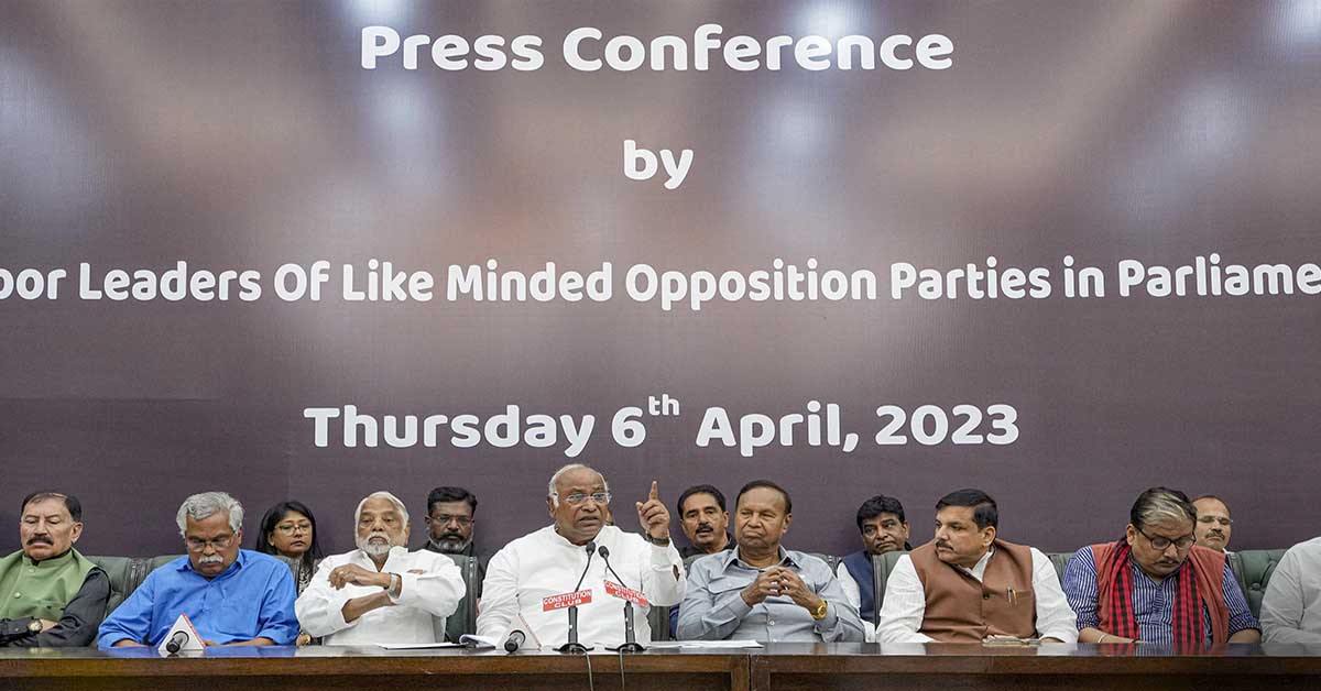 Addressing a joint press conference of opposition leaders at the Constitution Club after a "Tiranga March" from Parliament House to...