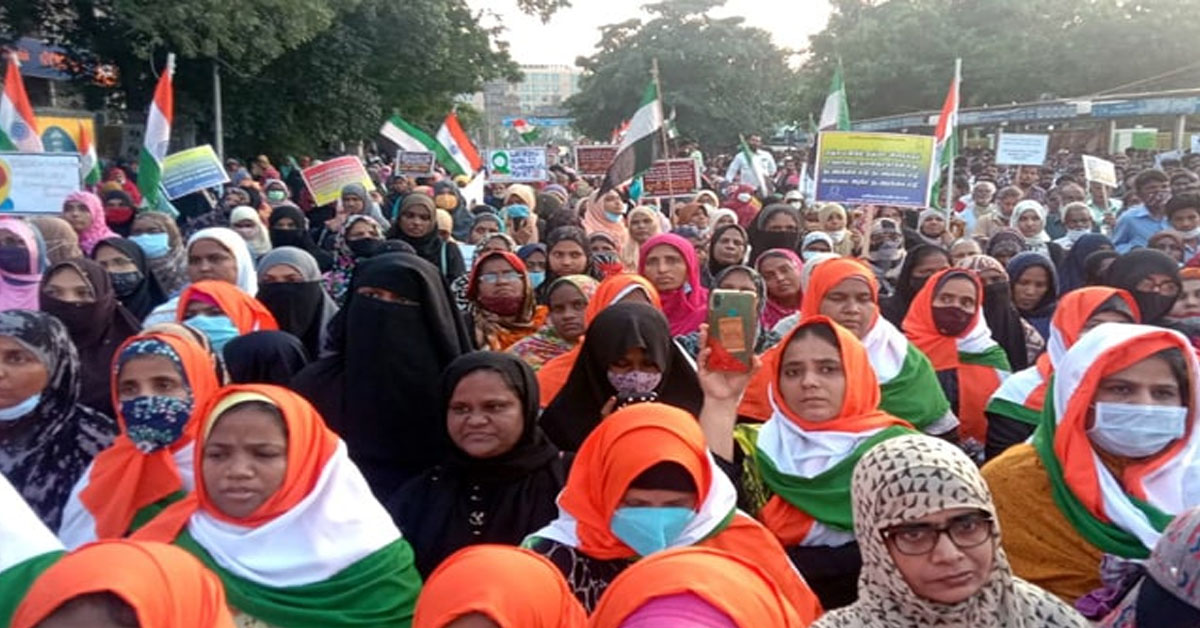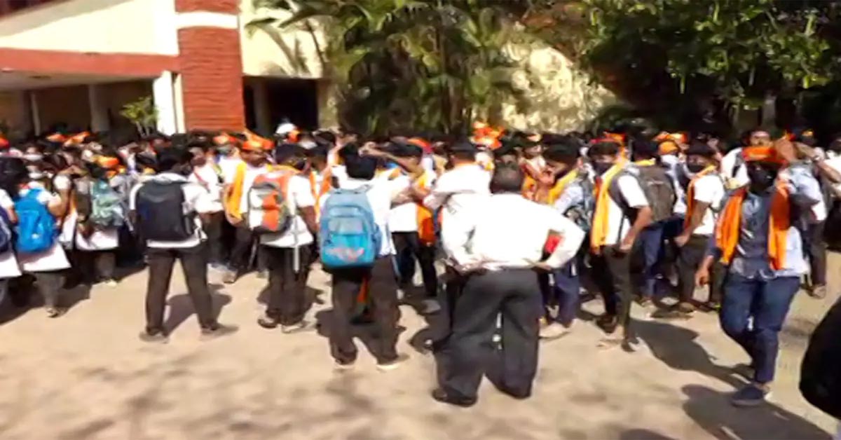 A massive crowd of students, one group in the hijab and another wearing saffron scarves, protested at a college in...