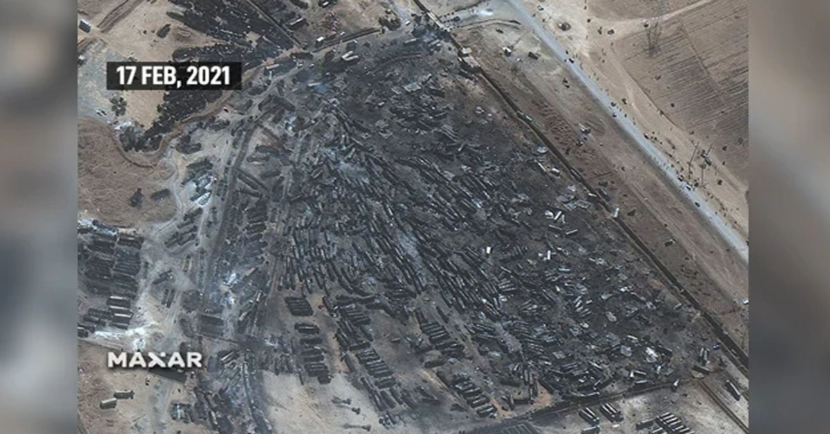 High resolution satellite imagery shows the impact of a massive fire that engulfed hundreds of trucks on February 13 at...